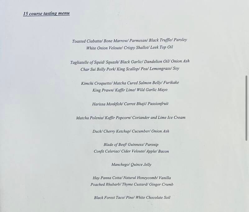Example menu from a 15 course tasting experience for 15 guests